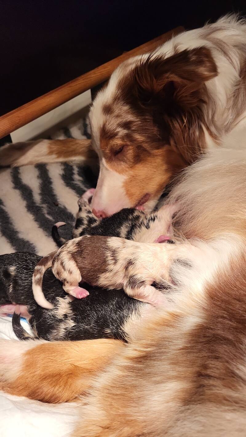 Jessy vind het sinds dag 1 geen enkel probleem dat we bij haar pups zijn. De andere honden ( Jersey en Jaydha) daarentegen wilt ze niet in de buurt van haar pups. We luisteren naar haar signalen en begeleiden dat zodat Jessy op ons blijft vertrouwen en daar geen stress van ervaart.